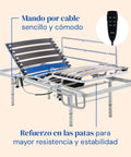 • Cama articulada: Estrado elétrico com estrutura em aço reforçado e ripas largas de madeira para um apoio seguro. Regula-se facilmente com comando por cabo, permitindo articular o encosto e as pernas com total comodidade. Compatível com acessórios opcionais.