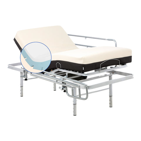 • Altura ajustável: Personalize a cama articulada conforme as suas necessidades com pés fixos de 25 cm ou pés reguláveis em 4 alturas (38–53 cm), facilitando tanto o acesso do paciente como o trabalho do cuidador.